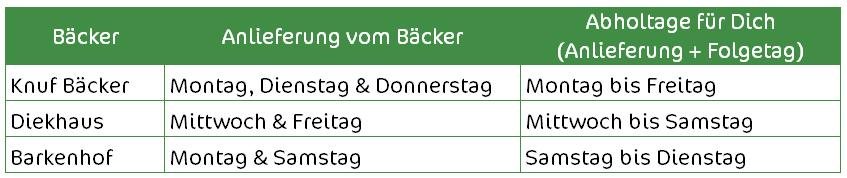 "Frische Brote werden täglich an unsere Filialen geliefert. Für Bestellungen von frischem Brot bitten wir dich, diese mindestens 3 Tage vor dem Abhol- oder Versandtermin anzugeben.